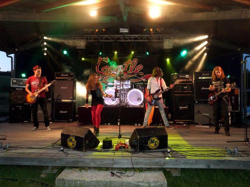 Am Ende ihres Programms dankten sie für die Einladung und wurden erst nach einer Zugabe („Aber i moch ma Sorgen um di“ von Hans Söllner) von ihrem begeisterten Publikum entlassen. Überwältigt von dem immensen Zuspruch der Gäste – das Seepark-Gelände war gänzlich überfüllt – zeigte sich der Vorsitzende des Arbeitskreises Seepark, Hermann Zapf. Die Veranstaltung dürfte wohl als die bisher bestbesuchteste (außer dem Spider-Murphy-Konzert im Jahr 2010) in die Erfolgs-Geschichte des „Bunten Sommers“ eingehen, meinte er. Sodann entfachte die Topband „Gentle“ ihr Feuerwerk der Rockmusik. Beginnend mit der auf einer alten Zündapp einfahrenden Frontfrau Katharina Fischer und dem Kulthit „Born to be wild“ zogen die vier Jungs das Seepark-Publikum auf den aufgestellten Sitzgarnituren und auf dem umlaufenden Rasen sofort in ihren Bann. Denn die Musikalität dieser Truppe war erstklassig und bewies eine ehrliche Leidenschaft für die Musik, die den Hardrock weltweit in die Hitparaden brachte. Die Band in der Besetzung mit Dominik „Dom“ Meindl (Leadguitar), Fabian Riederer (Rhythm-Guitar), Philipp „Phil“ Kastenholz (Drums) und Andreas „Mief“ Miefanger überzeugte in ihrer tempogeladenen Bühnenperformance mit Versionen von Rock-Klassikern ihrer Vorbilder AC/DC, Status Quo, Creedence Clearwater Revival, ZZ Top, Marius Müller Westernhagen, Rolling Stones, Motor Head, Lynyrd Skynyrd, BAP oder Chuck Berry. Aber auch Stücke wie der allererste selbstgeschriebene Song „Splashfire“ brachten das überwiegend jüngere Publikum so richtig zum Abrocken. Die Moderation des Abends lag dabei in den Händen von Rockröhre „Katha“, die in ihren Ansagen den Werdegang der einstigen (wenig erfolgreichen) Schulband bis hin zu einer der Top-Rockbands des Bayerwaldes aufzeigte. Ein verlorener Ausweis und das damit verbundene Kennenlernen von Phil aus NRW, die erste Bewerbung beim Songcontest Stögi-Cup in Roding und die zufällige Namensfindung (das vorgeschlagene „Hämorhyders“ wurde kategorisch abgelehnt) waren Meilensteine im Leben der Band Gentle. Ihre Freude über das fünfjährige Jubiläum, die vielen gekommenen Fans und das damit verbundene Lampenfieber wurden in der launigen Moderation spürbar. „Wir sehen uns immer noch als Newcomer. Ich stehe auf der Bühne und vergesse alles andere.“ Mit einer unglaublichen Energie, die man der kleinen Person gar nicht zugetraut hätte, wirbelte sie über die Bühne, schmetterte mit impulsivem Gesang ihre Hits ins Mikrofon, mischte sich singend unters Publikum und verzauberte alle mit ihrer ausdrucksstarken Stimme. Zerrende Gitarren, bebende Bässe und treibende Drums ihrer Musikerkollegen ließen den guten alten Garagen-Rock wieder aufleben und bewiesen Virtuosität an den Instrumenten. Für einen reibungslosen Ablauf hatten viele fleißige Hände hinter den Kulissen gesorgt. Denn die Bewirtung der vielen Gäste war Schwerstarbeit für die Helfer des AK Seepark, die beim Ausschank und beim Grillen für das leibliche Wohl sorgten. Die nächste musikalische Veranstaltung findet am Donnerstag, 3. Juli statt, wenn es heißt „Jazz und Swing im Seepark mit der OKiii Band“ aus Pilsen.