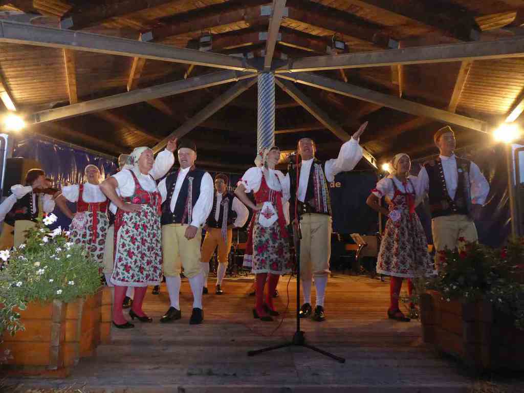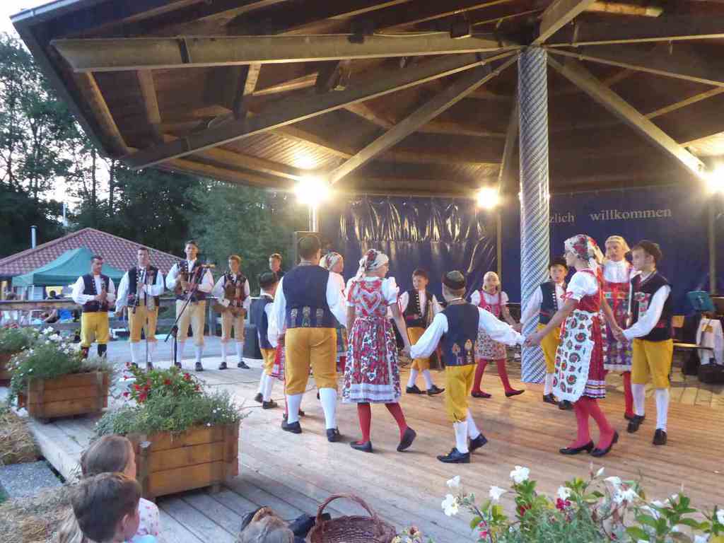 Dass die Choden sehr gesellige Menschen sind, zeigten sodann die Bühnendarbietungen der Kinder- und Erwachsenen-Folkloregruppen. „Beide Gruppen möchten die Schönheit der Tracht und Tradition verbreiten“, informierte die Ansagerin. Mit traditionellen Tänzen und Dudelsackmusik bereicherte die Kinder-Choden-Tanzgruppe „Mráček“ aus Mrákov („Detský chodský soubor Mrákovácek“) den Abend. Ihre Mitglieder waren im Alter von fünf bis 12 Jahren und rissen mit ihren jungen, strahlenden Gesichtern und der temperamentvollen Fröhlichkeit zu wahren Beifallsstürmen hin. Die chodische Volkskunstgruppe „Chodský soubor Mrákov/Chodengruppe aus Mrakov“ gehört zu den elf historischen Chodendörfern in Böhmen und trat in ihrer farbenprächtigen, regionalen Volkstracht auf. Sie verbreitete Spaß, Freundschaft und gute Laune durch seine Musikanten, Sänger, Tänzer und Unterhalter. Die Männer erschienen in gelben Pantalons, weißen Kniestrümpfen und Hüten mit breiter Krempe, während die Frauen kunstvoll bestickte Oberteile und Schürzen trugen. Die Choreografien der Tänze gaben einen Einblick in die Sitten und Bräuche der Region. Es waren Geschichten vom Alltagsleben, der Bauernarbeit auf dem Land, der Liebe oder dem Abschiednehmen, was die Buben und Mädchen, Frauen und Männer in ihren bunten Trachten in szenischen Darstellungen mit kräftigem Gesang und wirbelndem Tanz erzählten und wo die tschechische Volksseele in jedem Ton und jedem Schritt mitschwang. Im Chodsko-Kreis, einem sehr dynamischen und fröhlichen Tanz, wirbelte der Mann seine Partnerin schwungvoll herum. Und wer das Geschehen auf der Bühne genau beobachtete, konnte so manche Gemeinsamkeit mit dem bayerischen Kulturgut erkennen: So mancher Tanzschritt glich dem Zwiefachen oder dem Schottisch, meisterhaft, überzeugend und mit viel Rhythmusgefühl dargebracht. Begleitet wurden die Gesangs- und Tanzdarbietungen durch die regionaltypischen Instrumente Klarinette, Geige und Kontrabass. Ein wichtiges Musikinstrument war der „dudy“ (Dudelsack), aber auch etwas seltsam anmutende Instrumente wie ein Dreschflegel oder eine Teufelsgeige mit speziellem Kopf kamen zum Einsatz.